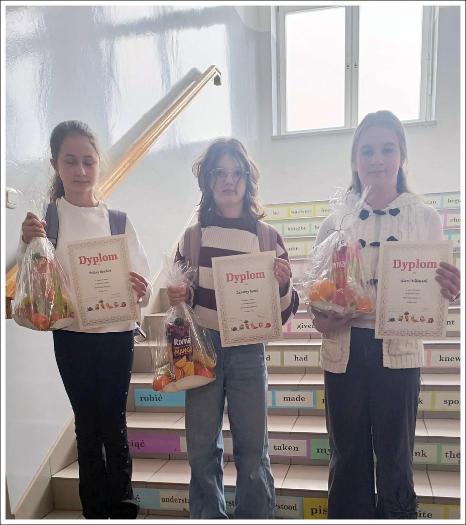 Nagrodzeni uczniowie otrzymali pamiątkowe dyplomy oraz owocową niespodziankę w postaci zestawu owoców. Pozostali uczestnicy otrzymali soczki. Gratulujemy zwycięzcom.