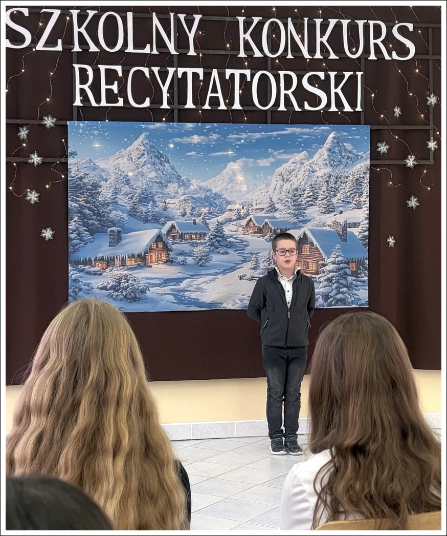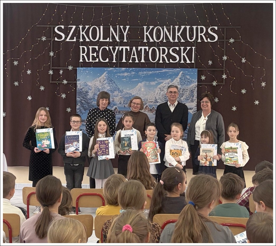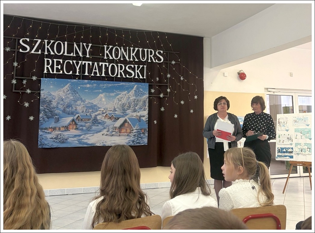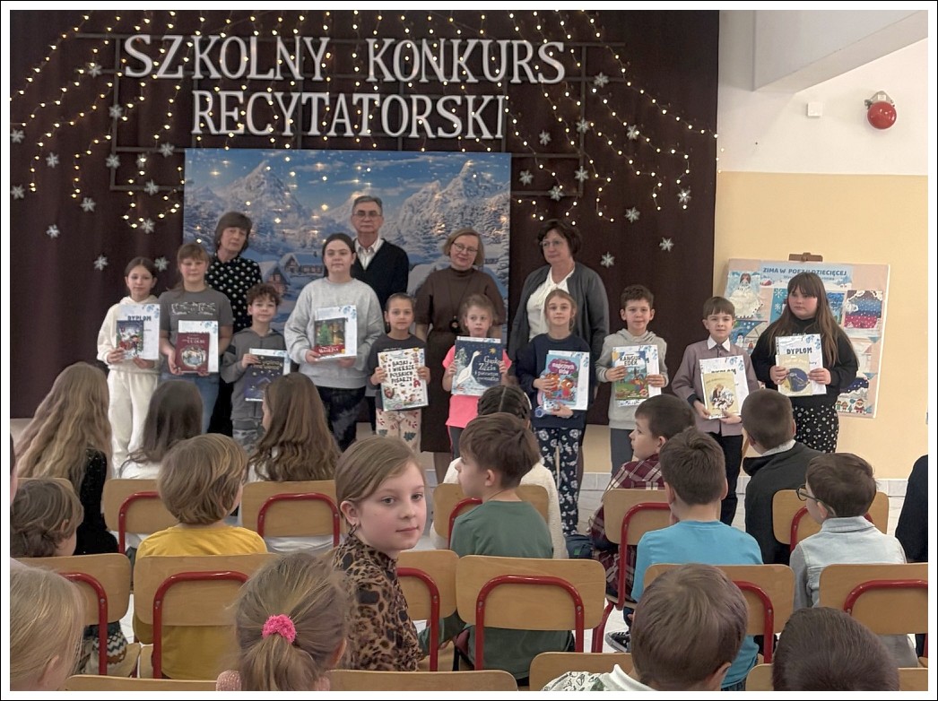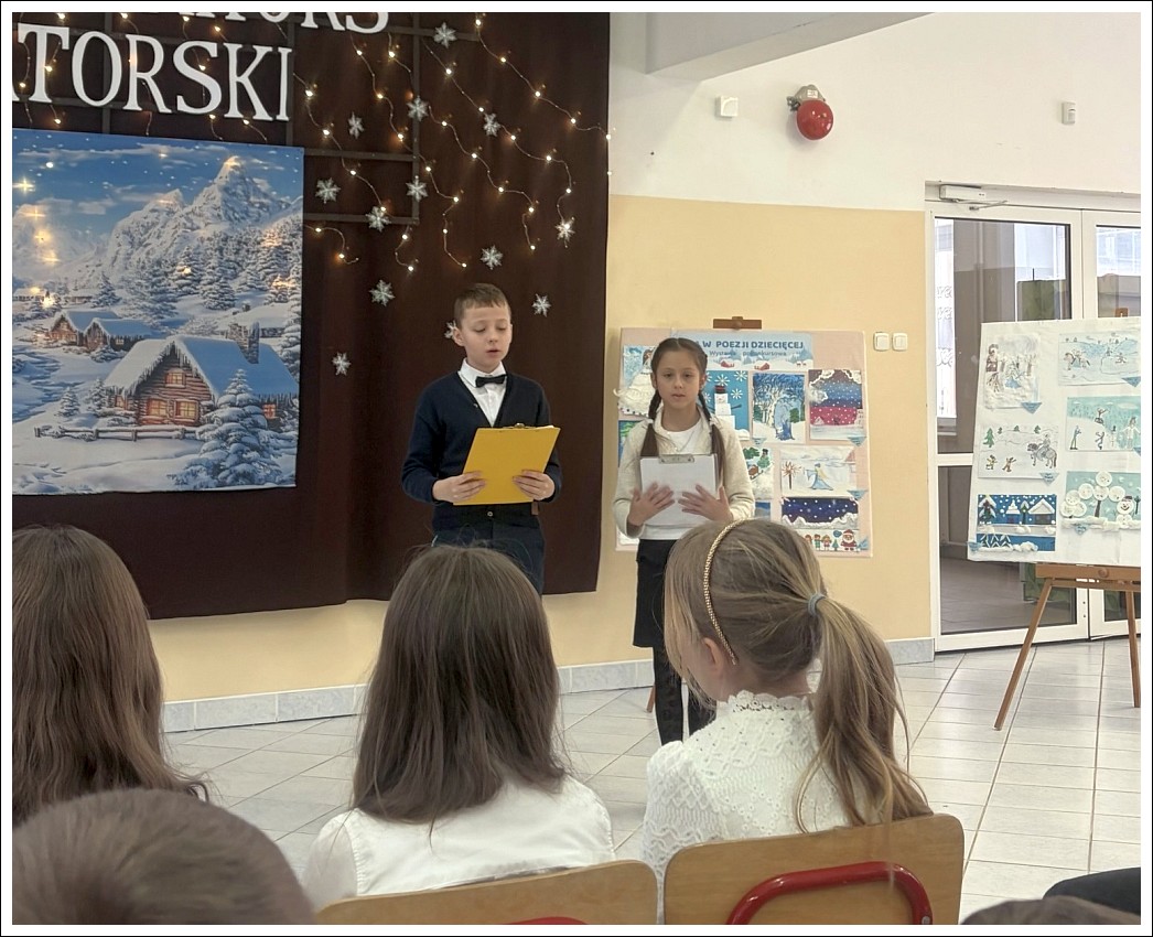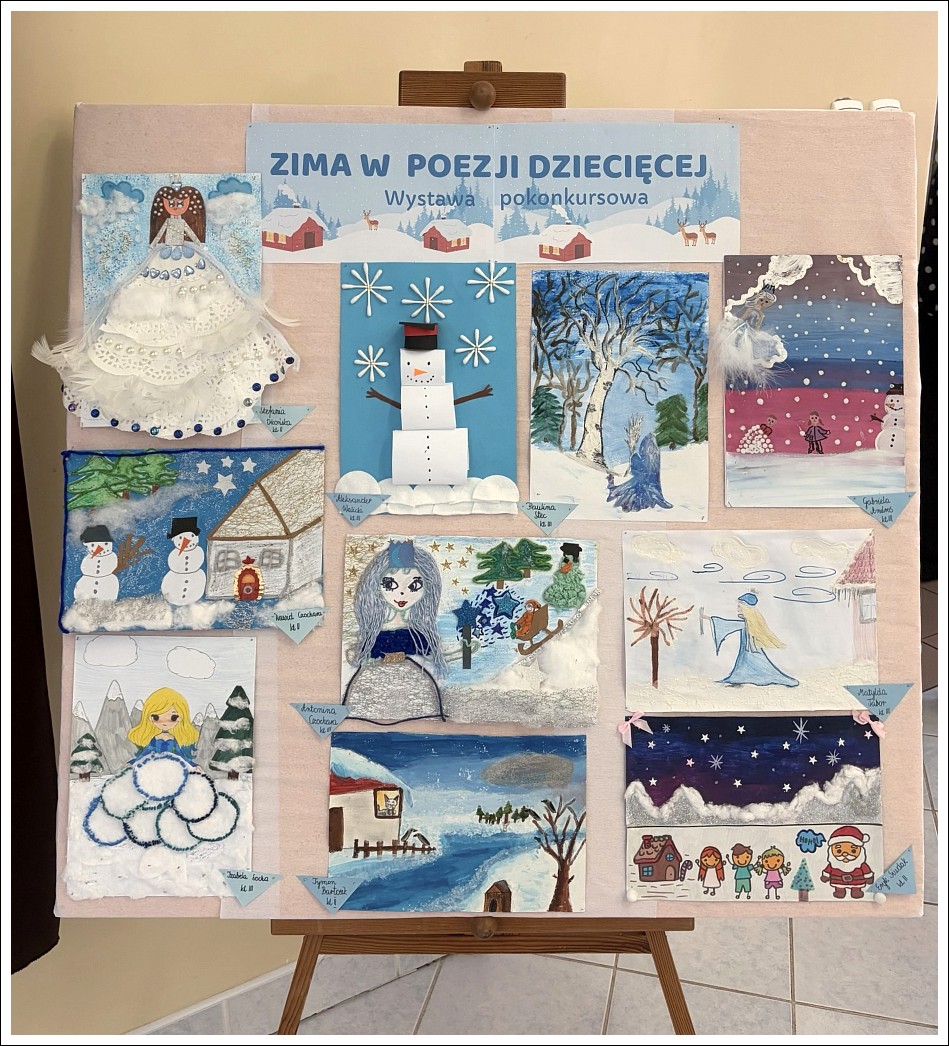 4 lutego w naszej szkole odbył się Szkolny Konkurs Recytatorsko-Plastyczny pt. „Zima w poezji dziecięcej”, skierowany do uczniów klas 0–III. Organizatorkami konkursu były pani Zofia Krupa oraz pani Lucyna Gancarz, którym serdecznie dziękujemy za zaangażowanie i przygotowanie wydarzenia. Występy uczestników oraz prace plastyczne oceniało jury w składzie: