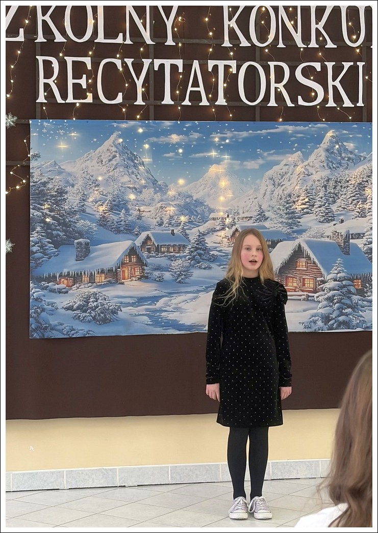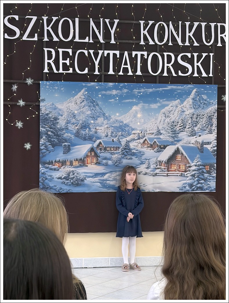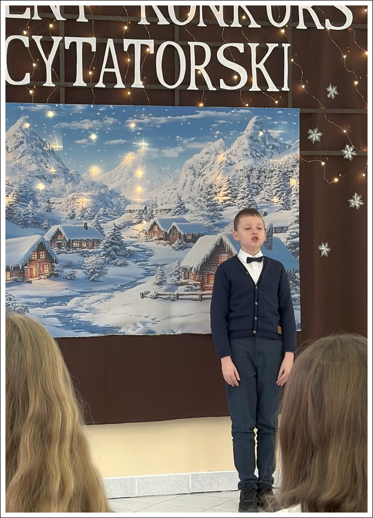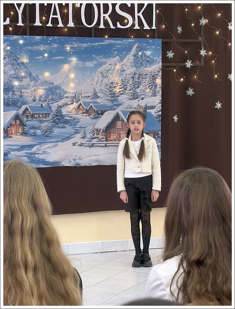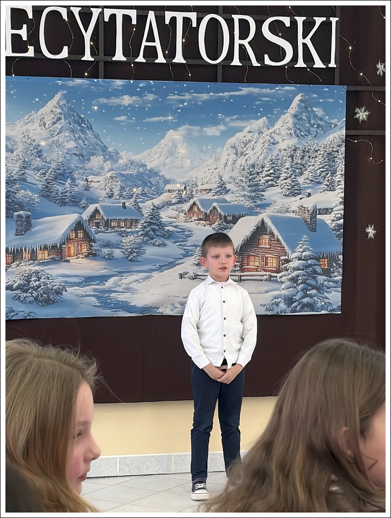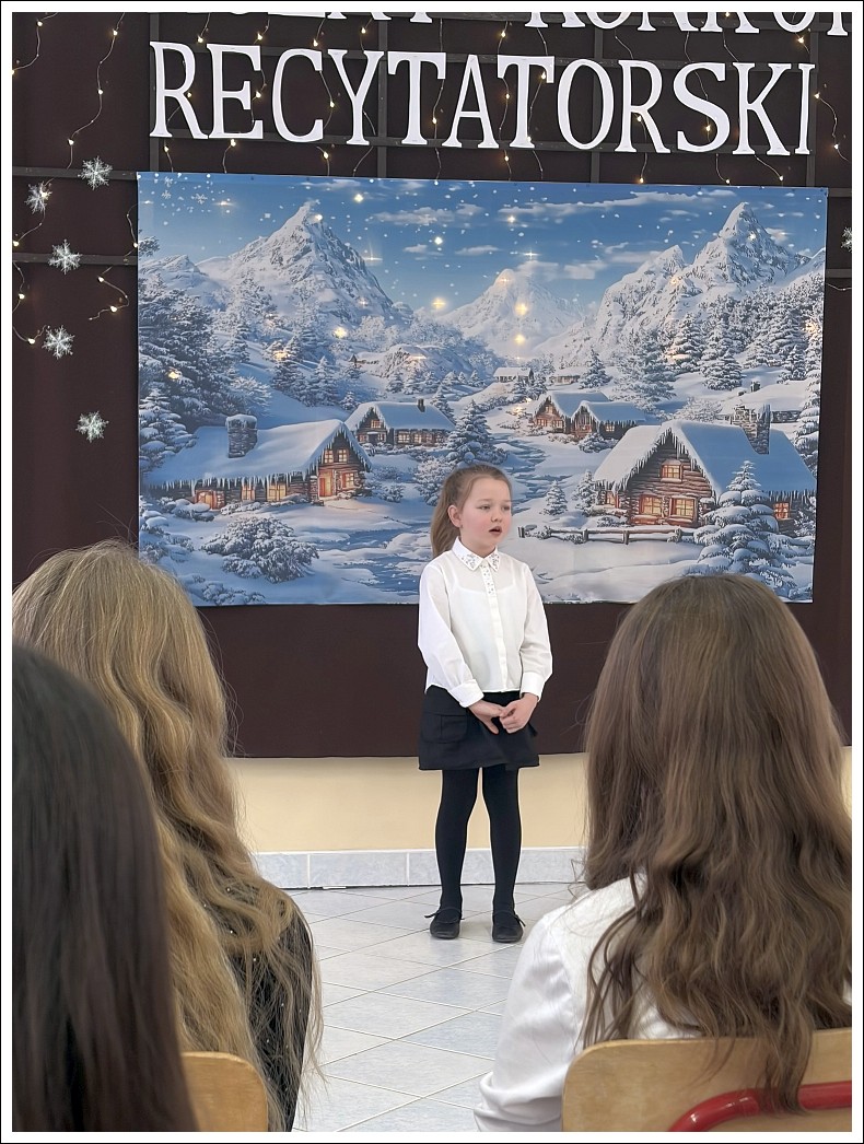 4 lutego w naszej szkole odbył się Szkolny Konkurs Recytatorsko-Plastyczny pt. „Zima w poezji dziecięcej”, skierowany do uczniów klas 0–III. Organizatorkami konkursu były pani Zofia Krupa oraz pani Lucyna Gancarz, którym serdecznie dziękujemy za zaangażowanie i przygotowanie wydarzenia. Występy uczestników oraz prace plastyczne oceniało jury w składzie: