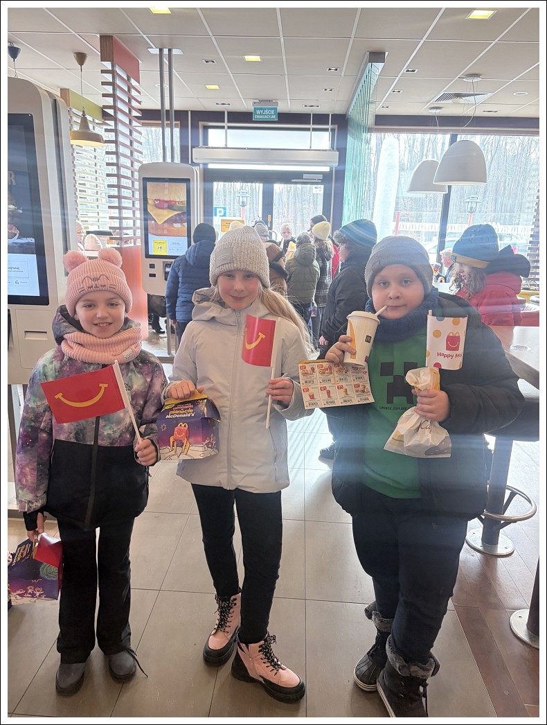 10 lutego uczniowie klas I–III wzięli udział w wycieczce do kina. Dzieci obejrzały film „Moon: Panda i ja” – familijną opowieść przygodową, która porusza temat przyjaźni, odwagi oraz szacunku wobec przyrody. Po projekcji uczniowie udali się do restauracji McDonald’s, gdzie mieli okazję wspólnie zjeść posiłek i spędzić czas w miłej atmosferze. Wycieczka była udana i stanowiła atrakcyjną formę integracji oraz spędzenia dnia poza szkołą.